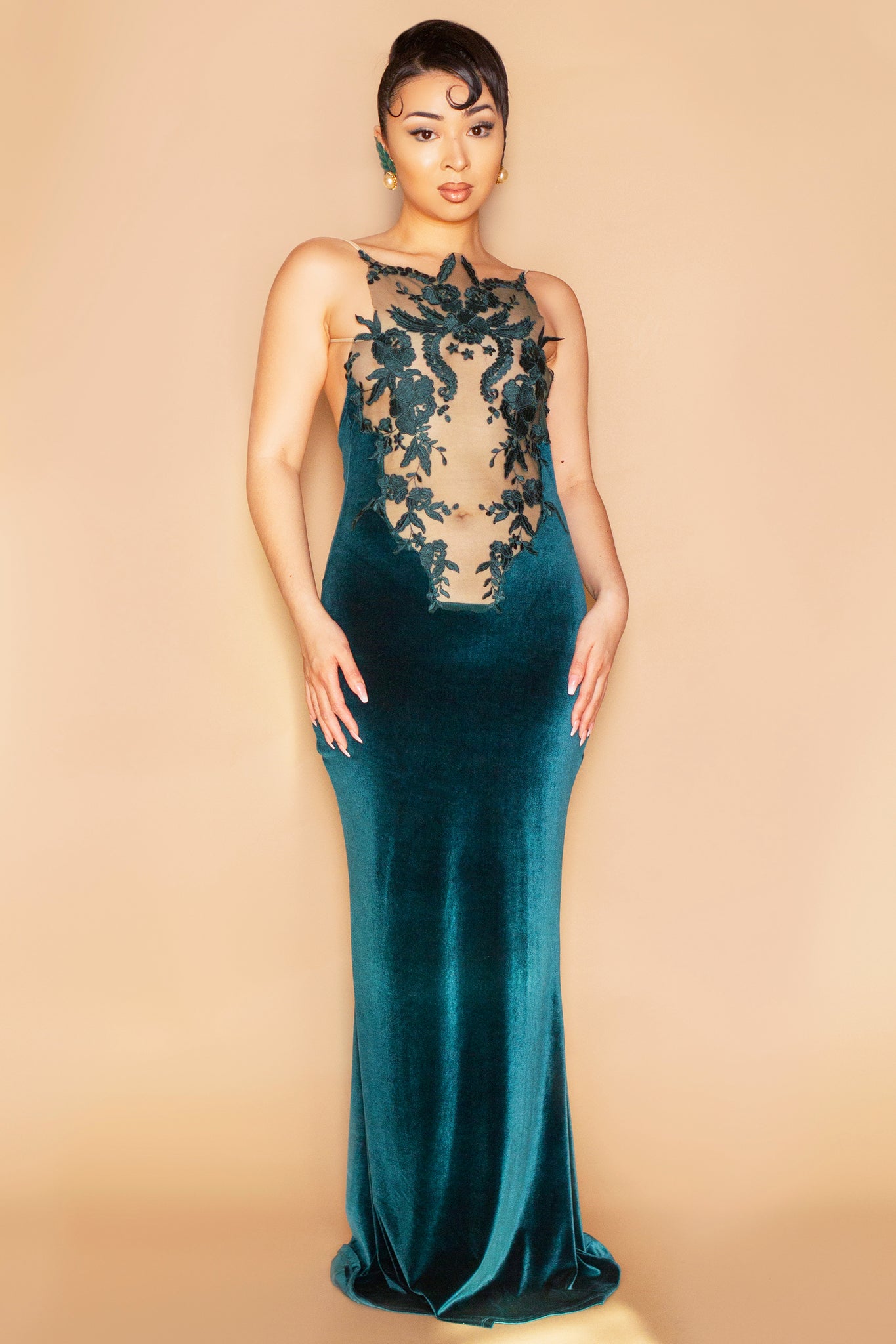 Anaïs is a head turning piece for the most prestigious occasions. Designed to create a spectacle for performance, red carpet, and more. Features a barely there mesh illusion front that can be combined with strapless bra, adhesive bra, covers, or left bare. Draping peacock blue, lush velvet in a fit and flare silhouette compliments the physique making you the star of the show.