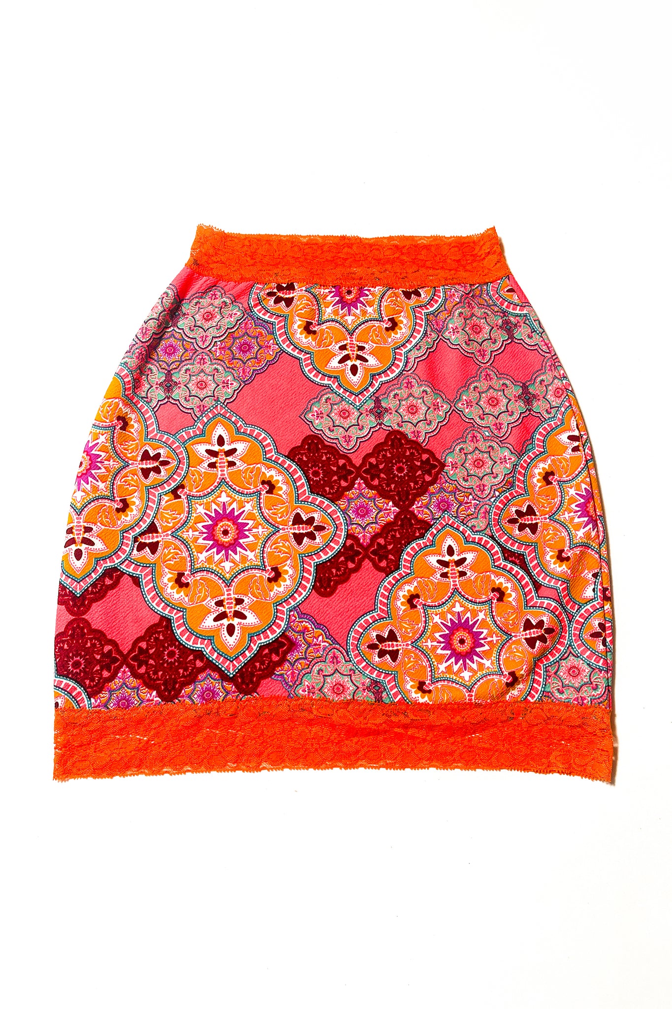 Limited edition bodycon skirt with highwaist rise. Thick, stretchy, and textured scuba crepe knit fabric with hot orange stretch lace detailing. Fitted silhouette with a hemline hitting a few inches above the knee.