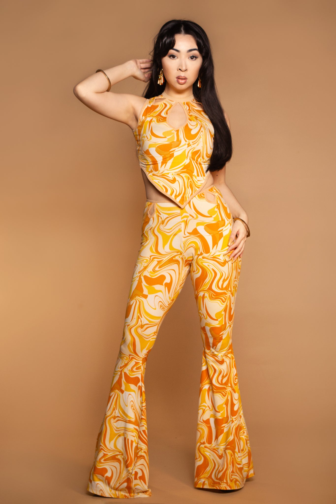 Mid rise bellbottom flares in a buttery soft, psychedelic swirl print, in shades of yellow.  Nude mesh outlining at the 4 cut out points that adorn the waistline.  Easy care, wrinkle resistant material makes this great for travel.  Pair with the matching top for full set.