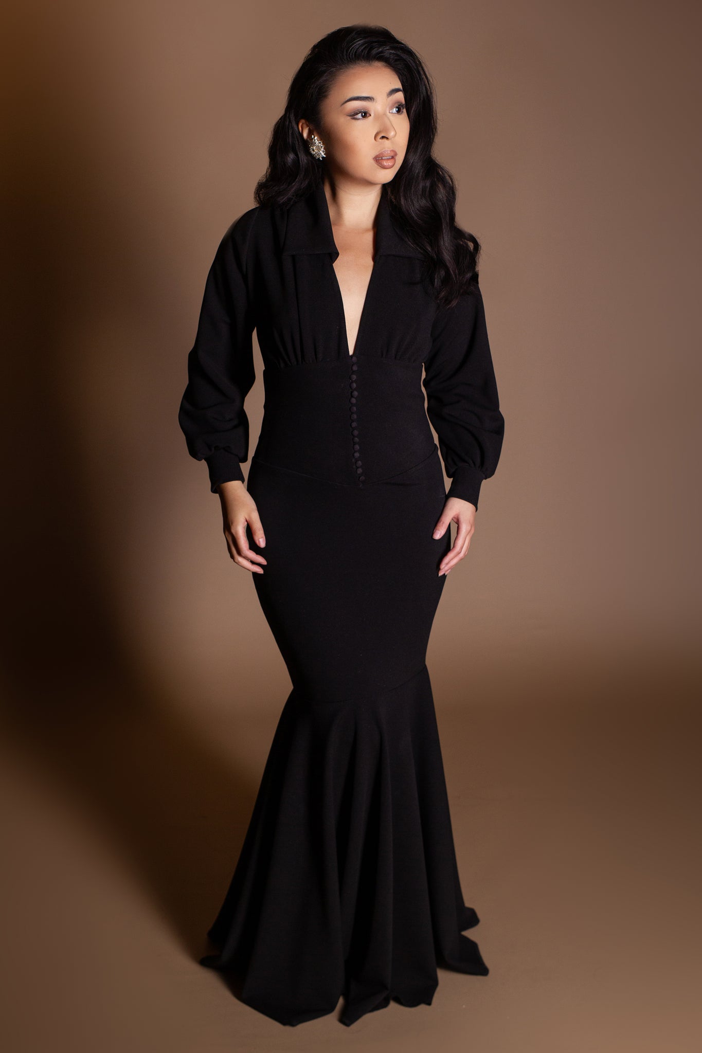 Sophisticated black crepe dress with body hugging, mermaid silhouette. Functional button up front with bridal styled loop and tuxedo buttons. Slight puff sleeve with cuffs and plunge neckline with collar.