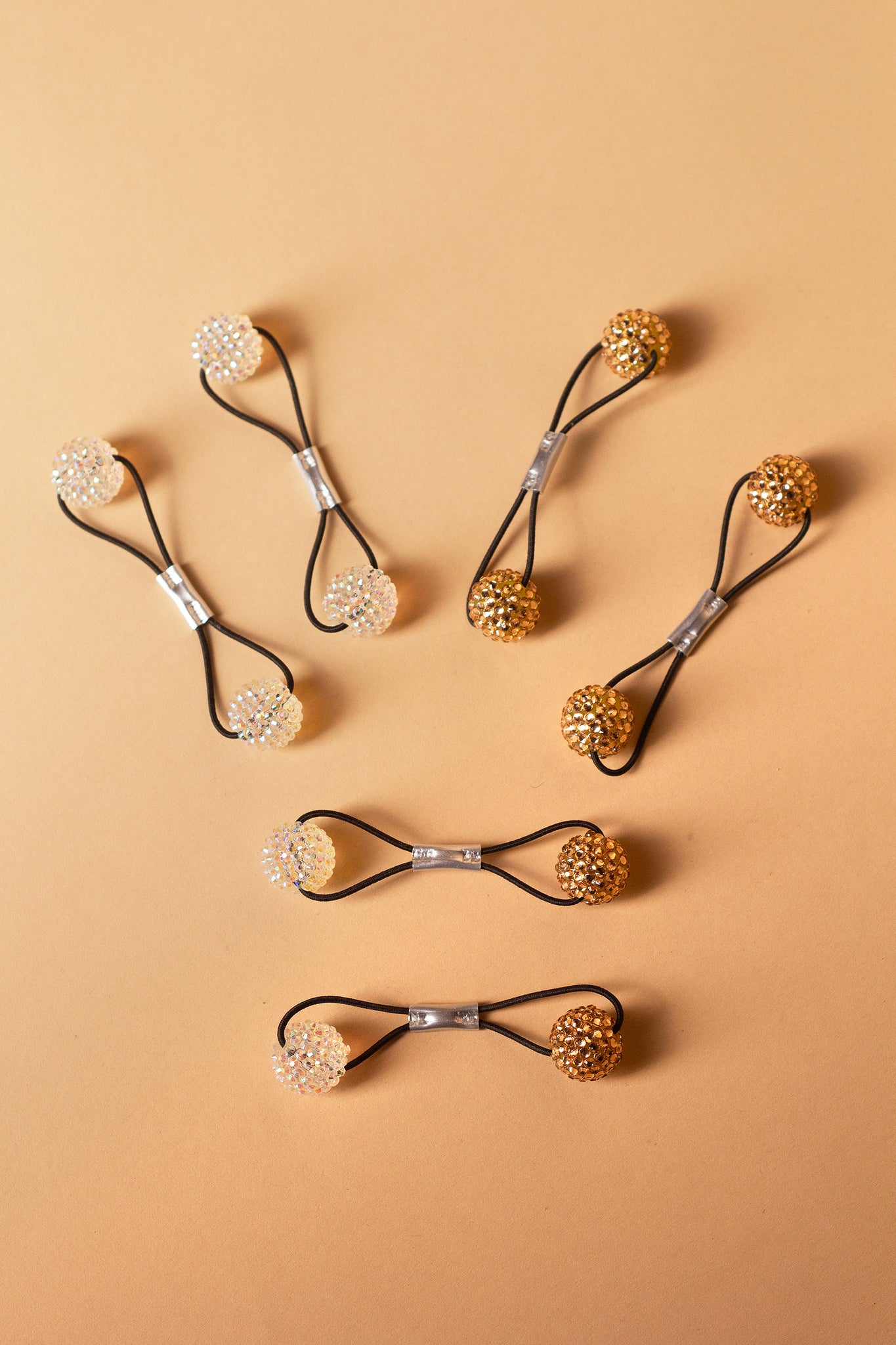 A childhood favorite hair accessory in a jeweled, rhinestone studded variety. Customize to mix and match your own gem pairings choosing between Frost, Bronze, and a two toned option. Measures just over 3/4" in diameter.