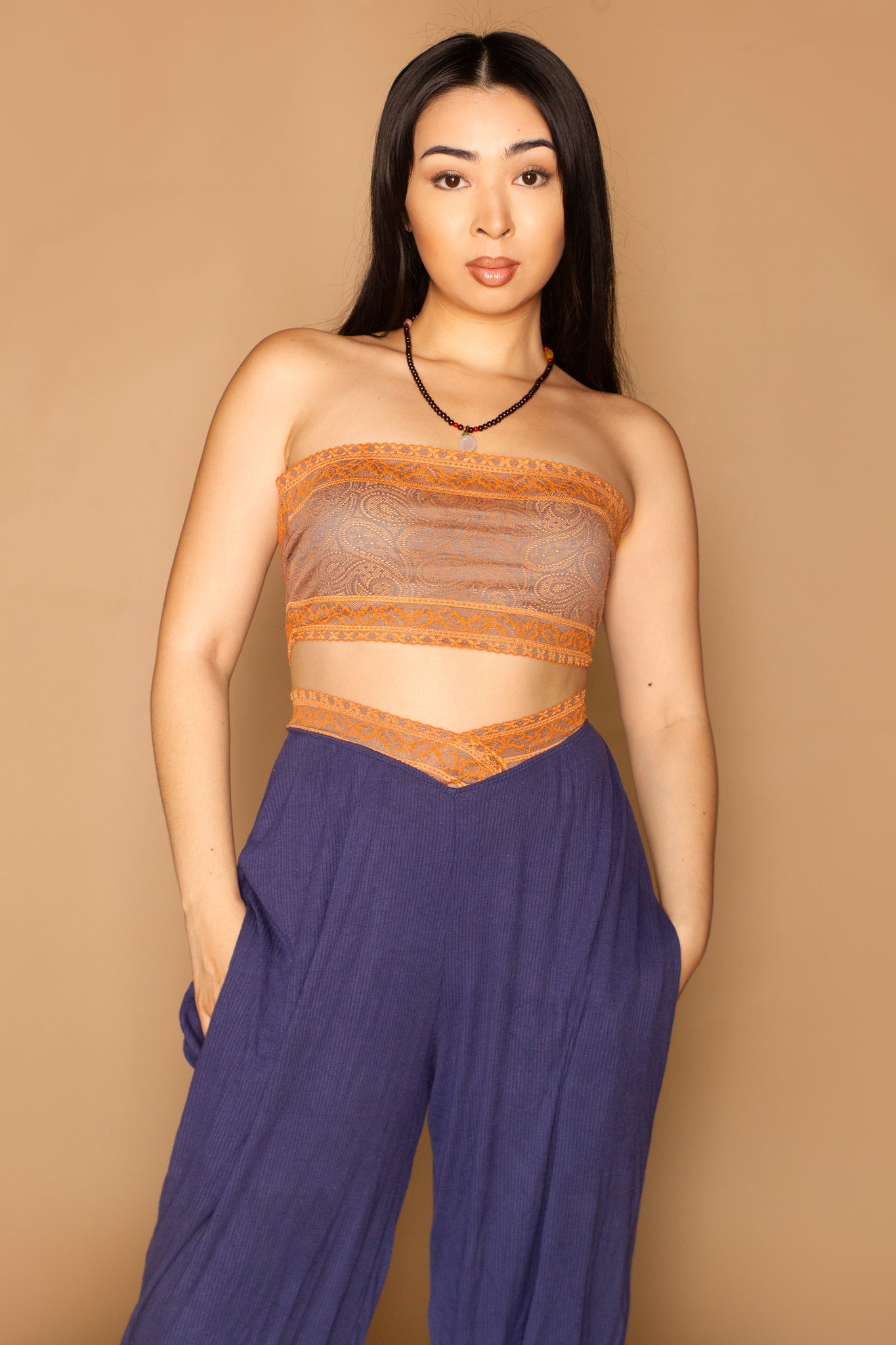Jorani Lace Bandeau Bra is a semi-sheer bandeau with leaf print, paisley, and scallop edging. Looks great layered and paired with the Jorani panty or pants.